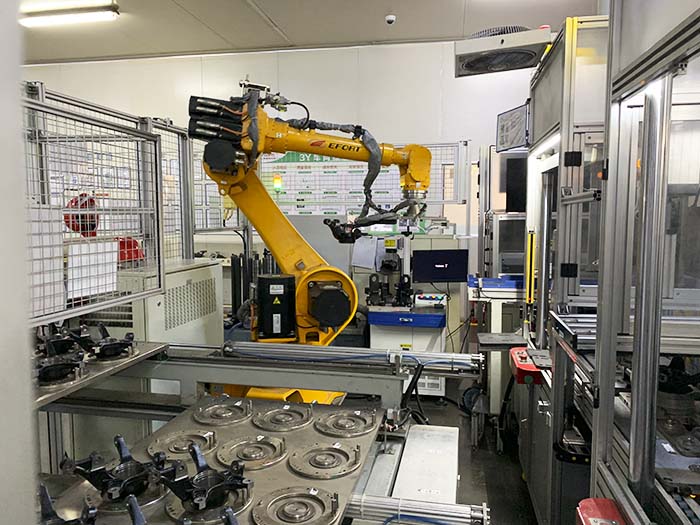 機器人通過拆垛方式,依次抓取24工位自動推拉轉向結平臺上需加工的轉向結,運動至激光打印機處自動打標。完成后運動至12工位旋轉軸承料倉處取軸承。此軸承料倉為全自動化設備,可直接將軸承旋轉頂升至固定點位。機器人抓取軸承后,通過與機床信號交互,實現放入待加工的轉向結和軸承,控制機床壓裝,并隨流水線流入下一工位。 整套系統高效配合該流水線生產節(jié)拍,達到用戶要求。并節(jié)約50%的人力成本,同時緩解了此環(huán)節(jié)中重復度高、招工難的問題。